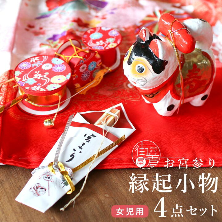 楽天市場 日本製 お宮参り 縁起小物 4点セット 女の子用 犬張子 でんでん太鼓 扇子 末広 化粧箱 付き 赤 名入れ 祈願 お祈り 玩具 張り子 のしめ 一つ身 初着 お初着 御祝着 ベビー 赤ちゃん 産着 子供 キッズ 新生児 Fu110 街着屋 きもの遊び